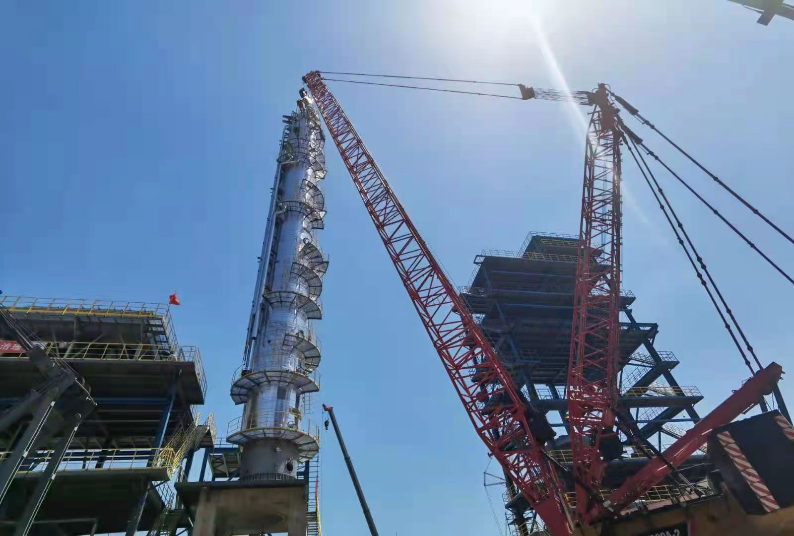 2021年6月20日至22日,由勝幫科技股份有限公司總承包建設的陜煤集團榆林化學有限責任公司1500萬噸/年煤炭分質清潔高效轉化示范項目熱解啟動工程,懸浮床加氫裝置原料分餾塔(T101)和懸浮床熱高壓分離罐(V-404)順利吊裝完成,此兩臺設備的順利吊裝標志著懸浮床加氫裝置大件吊裝完美收官。 原料分流塔和熱高壓分離罐是懸浮床加氫裝置中的關鍵設備,也是整個熱解啟動工程項…