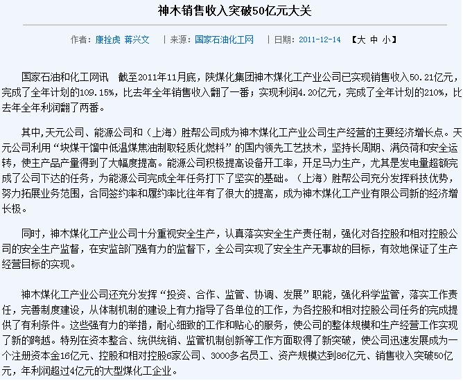 據國家石油和化工網訊 截止2011年11月底,陜煤化集團神木煤化工產業公司銷售收入大增。其中,上海勝幫公司充分發揮科技優勢,努力拓展業務范圍,合同簽約率和履約率比往年有了很大的提高,成為神木煤化工產業有限公司新的經濟增長極。