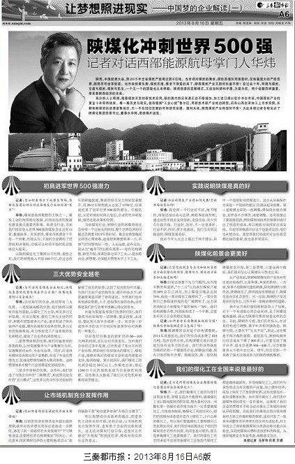陜煤化沖刺世界500強記者對話西部能源航母掌門人華煒陜西,中國能源大省,到2015年全省煤炭產(chǎn)能將達到6億噸。當市場對煤炭的需求,因經(jīng)濟增長而強勁時,僅依靠龐大的產(chǎn)能優(yōu)勢,陜西盡可坐享財富。當市場供需失衡,煤炭壓港、需求下滑真的來了,陜西煤炭產(chǎn)業(yè)又因何長盛不衰?在過去十年,環(huán)境與煤炭、交通與煤炭、煤炭與民生,一個又一個的質疑也從未停歇。陜西能源的發(fā)展模式,又…
