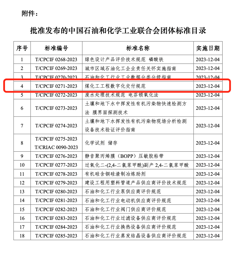 近日,由勝幫科技股份有限公司參與制定的《煤化工工程數(shù)字化交付規(guī)范》團體標準(T/CPCIF 0271-2023)通過中國石油和化學工業(yè)聯(lián)合會標準化工作委員會審查通過,于2023年9月4日正式發(fā)布,2023年12月4日起正式實施。