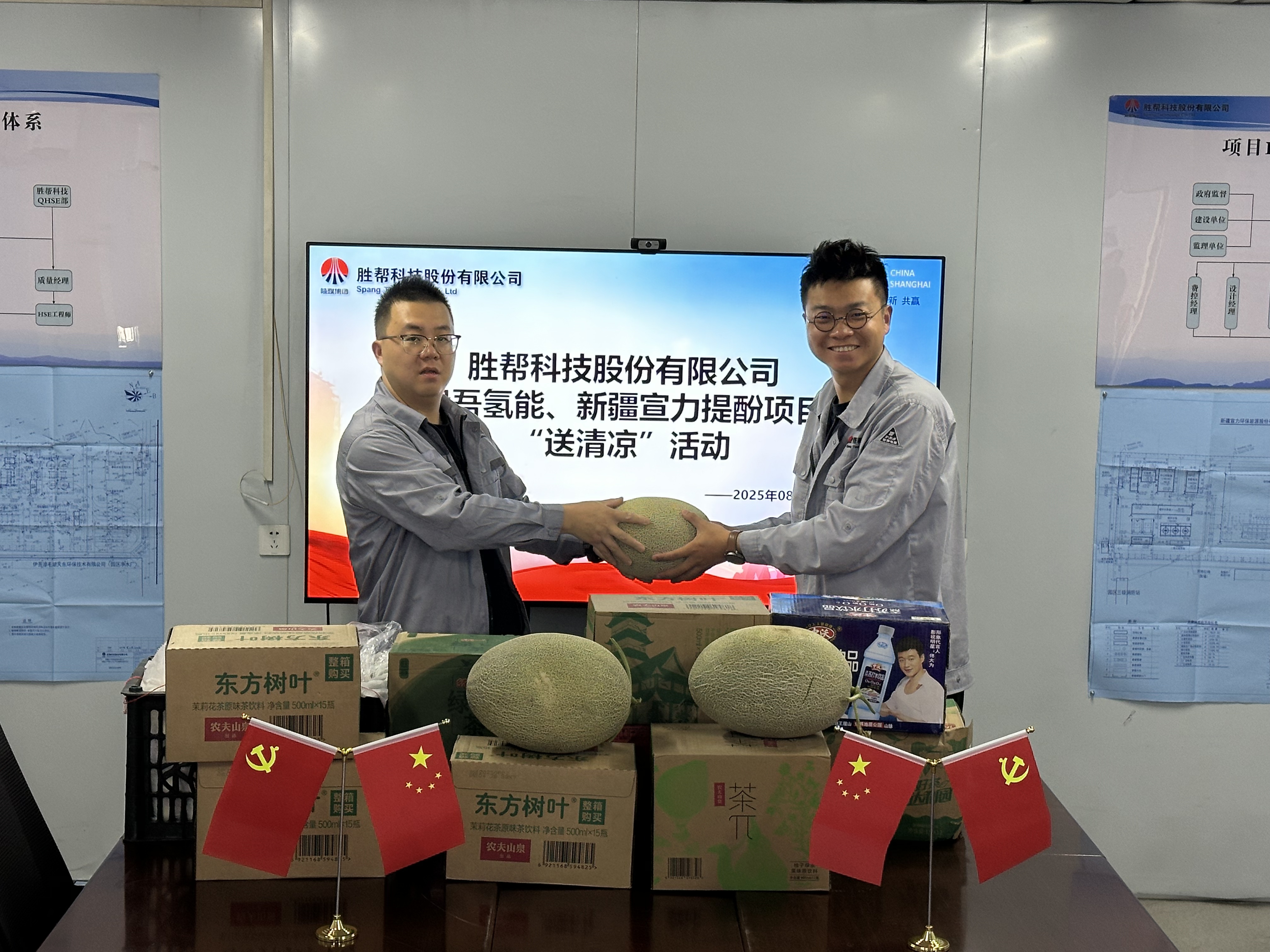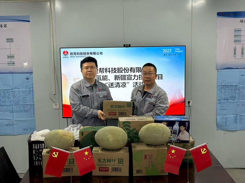 時值盛夏,驕陽似火。為切實做好高溫季節員工關懷工作,保障項目一線員工的身心健康與安全生產,2025年8月11日,勝幫科技股份有限公司副總經理盧貝、項目經理張浩一行,冒著酷暑,不遠萬里,專程抵達勝幫科技位于新疆哈密淖毛湖地區項目現場,代表公司親切慰問奮戰在艱苦環境中的一線員工,并組織開展“夏日送清涼”活動,為員工們送去公司的深切關懷和絲絲清涼。