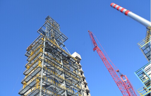 高聳入云的焦炭塔框架,恨比天低。旁邊是項(xiàng)目上的大力士:三一重工的400噸級(jí)吊車,主要負(fù)責(zé)重型和高聳結(jié)構(gòu)的吊裝,如焦炭塔、焦炭塔框架、分餾塔等。